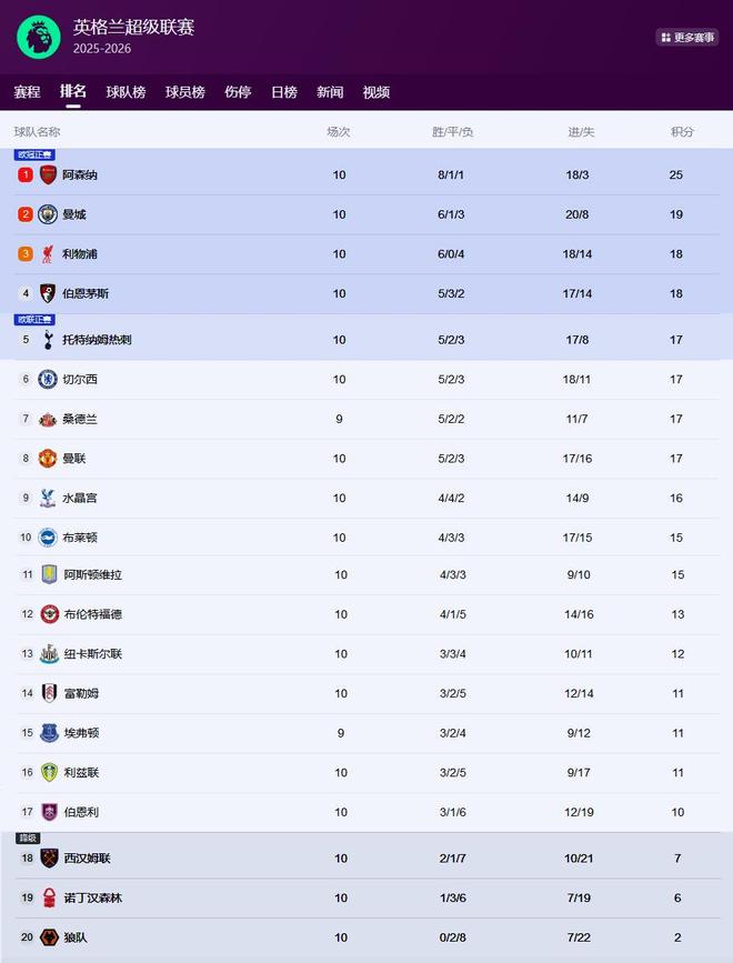 自從首輪2-4不敵利物浦后,伯恩茅斯已經(jīng)連續(xù)8輪不敗(5勝3平),最終曼城送給伯恩茅斯近9輪首敗。此役獲勝后,曼城10輪積19分升至第二位,距離榜首的阿森納6分。積18分的伯恩茅斯,則降至第四位。